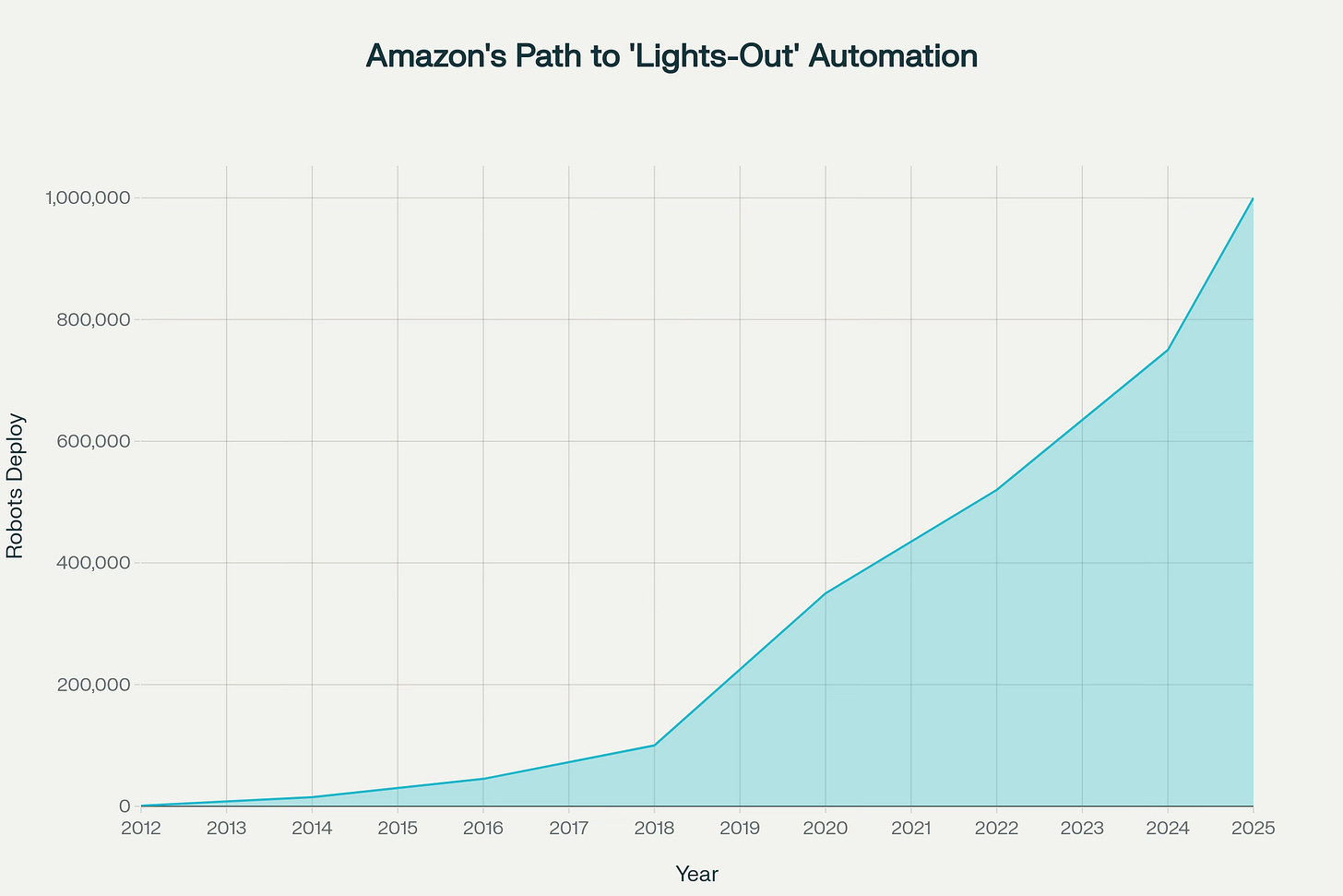 Amazon deployed 1 million robots by 2025, a 1,000x increase from 2012. Automation rose from 5% to 75% of operations, creating a structural moat competitors cannot replicate without equivalent capital investment and engineering talent.