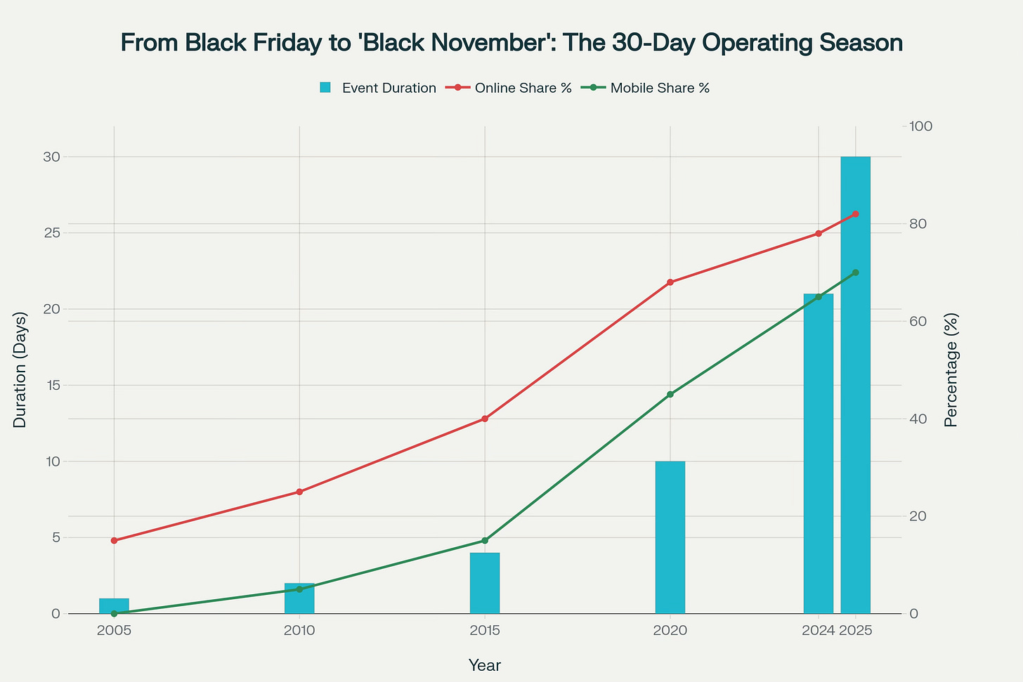 BFCM expanded from a 1‑day event in 2005 to a 30‑day season by 2025, with online transactions rising from 15% to 82% and mobile commerce driving 70% of all transactions. This evolution forced retailers to redesign operations from managing discrete daily spikes to orchestrating month‑long demand waves.