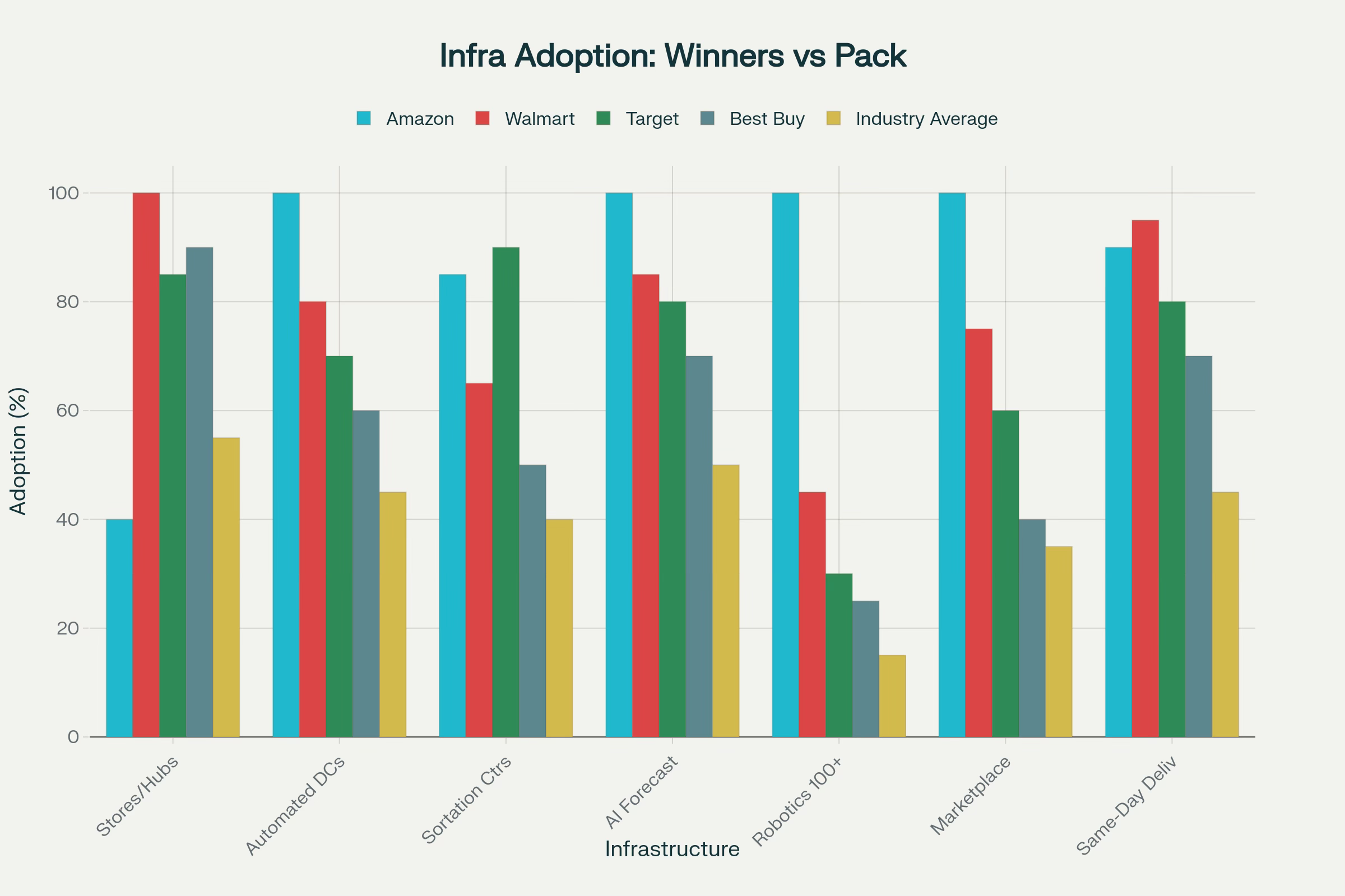 Amazon leads in robotics (100%) and AI forecasting (100%). Walmart dominates stores-as-hubs (100%) and same-day delivery (95%). Target excels in sortation centers (90%). Each company built distinct structural advantages; no company dominates all categories. The industry average lags significantly across most infrastructure types, revealing why incumbents struggle to match leaders.