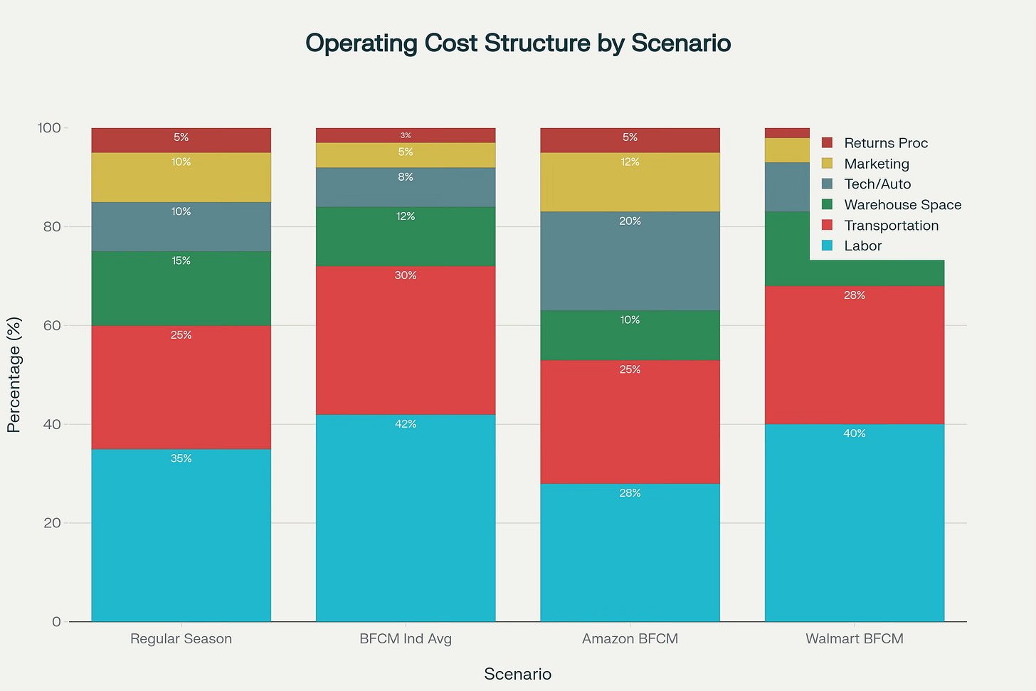Amazon allocates 20% of BFCM operating costs to technology and automation (vs. 8% industry average), enabling it to reduce labor costs to 28% of total spend. Walmart’s stores-as-hubs model concentrates 40% of peak costs in labor, reflecting its reliance on a distributed store network. This structural cost divergence compounds annually. Amazon’s automation investments reduce per‑unit fulfillment costs while Walmart’s labor dependency creates ongoing wage pressure. Target and Best Buy operate in between, but neither approaches Amazon’s technology‑cost ratio. The chart reveals why Amazon’s robotics moat is economically durable: competitors cannot match its automation spending without fundamental business model restructuring.