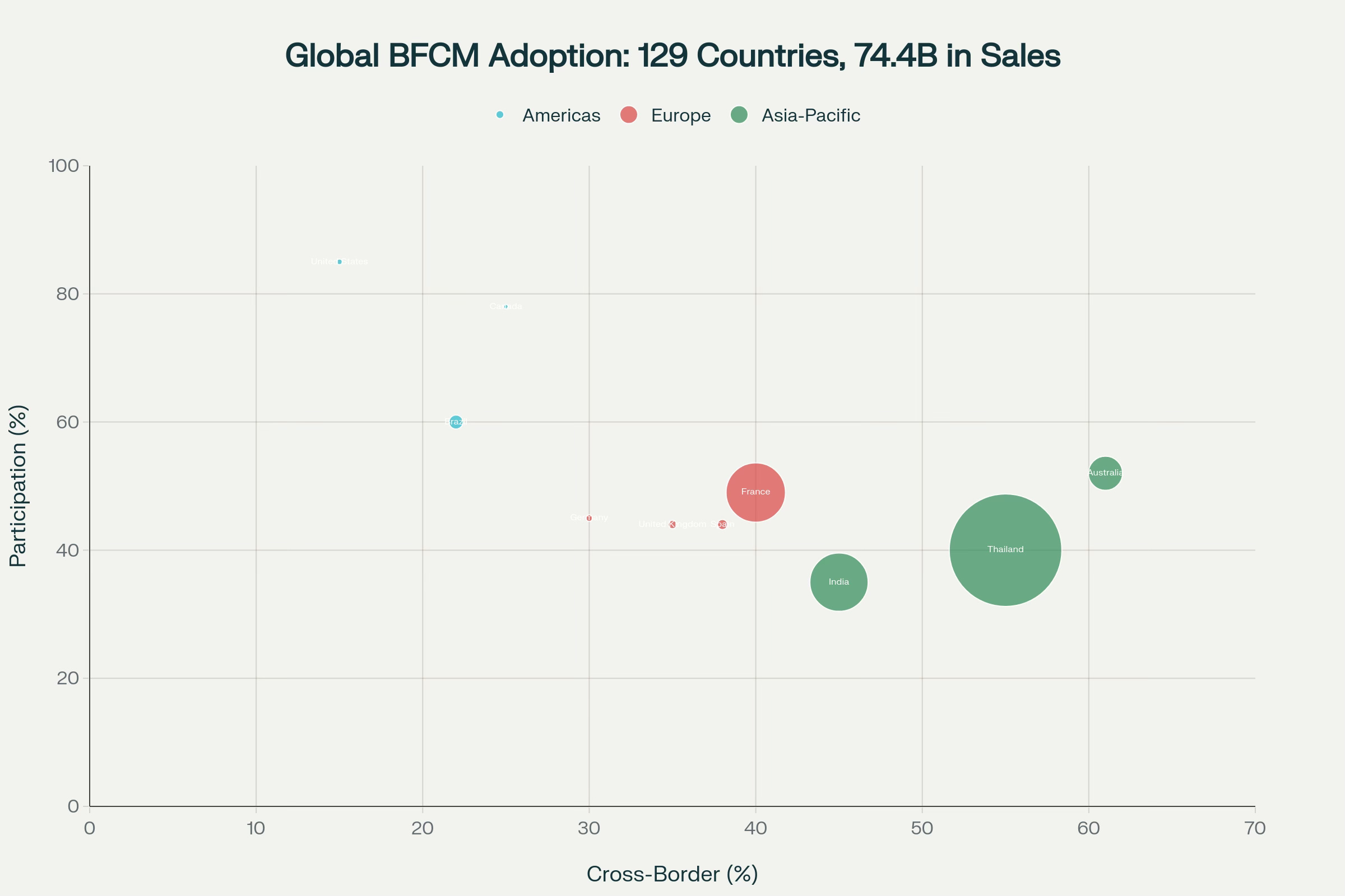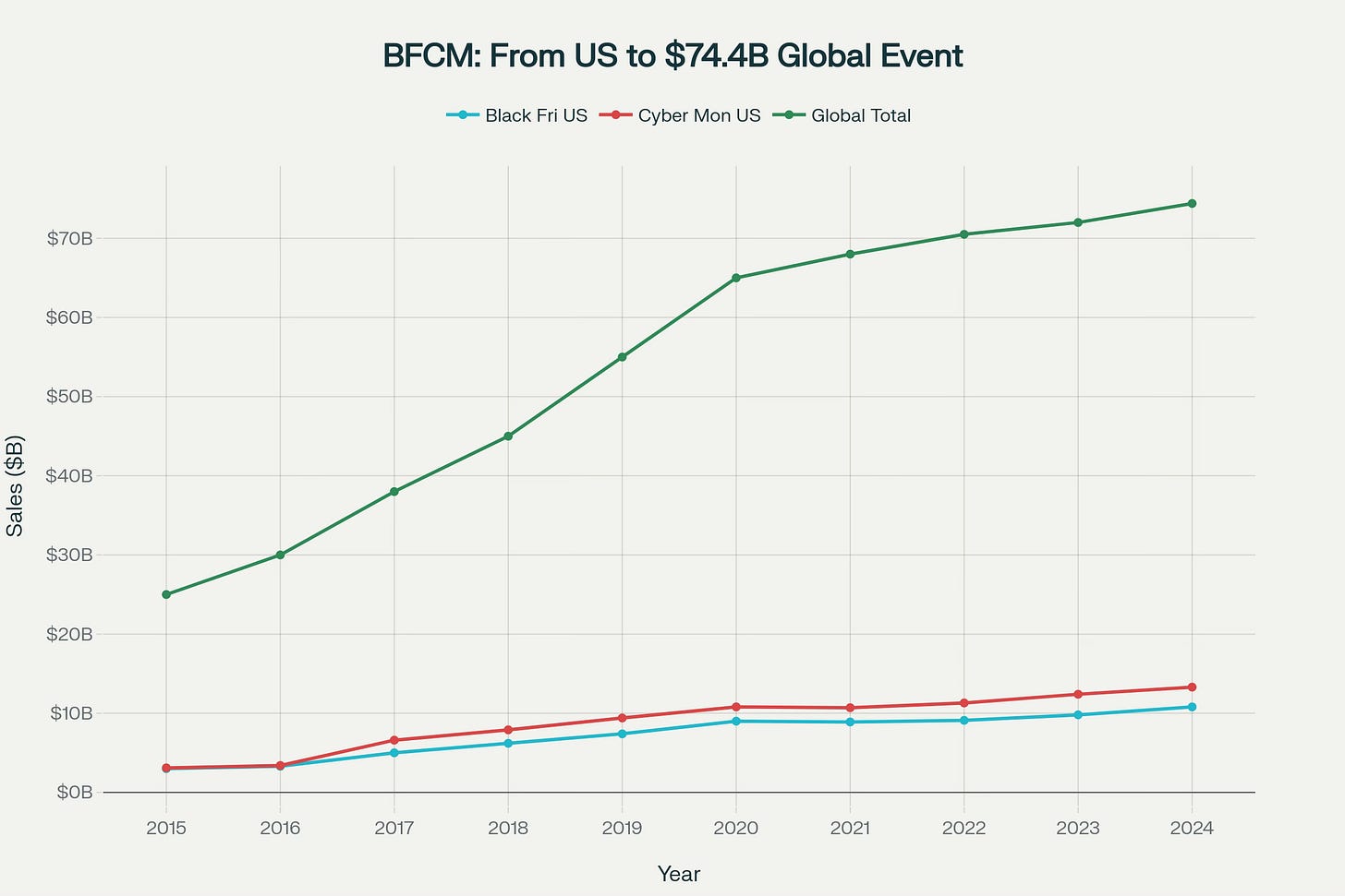 Global BFCM sales grew from $25B (2015) to $74.4B (2024), while US Black Friday and Cyber Monday combined grew from $6.1B to $24.1B over the same period. The phenomenon transformed from a regional American event into a global operating infrastructure.