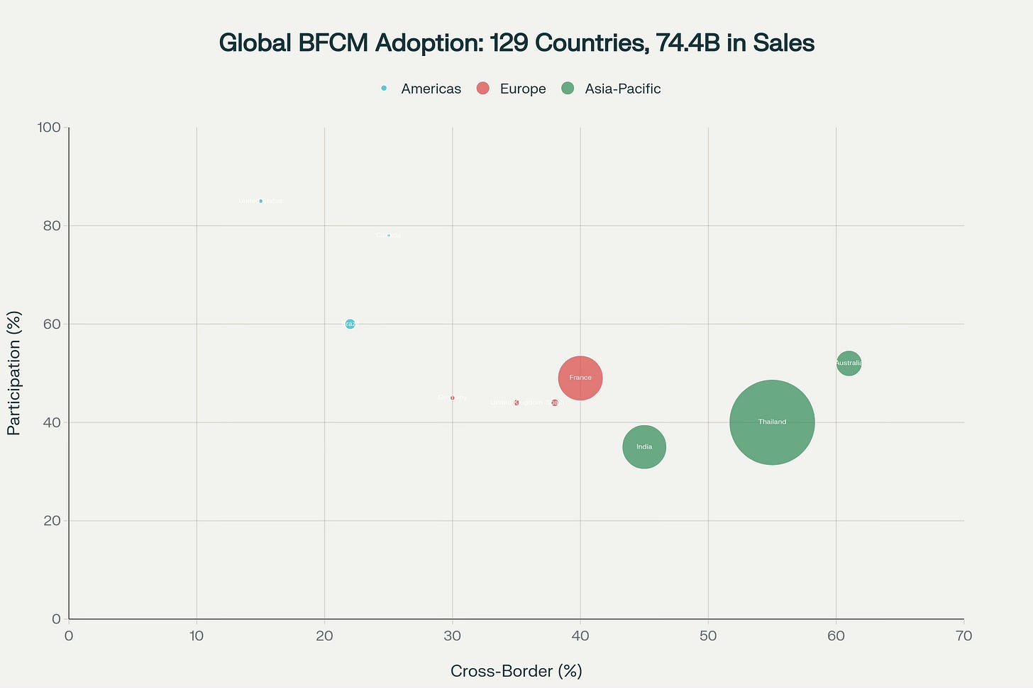 But the spread was not uniform. Cross‑border e‑commerce revealed regional power dynamics. Thailand experienced a 201% year-over-year growth in BFCM sales in 2020. France grew 106%. India grew 104%. But these countries weren’t building their own BFCM infrastructure, they were importing American retail operating models.