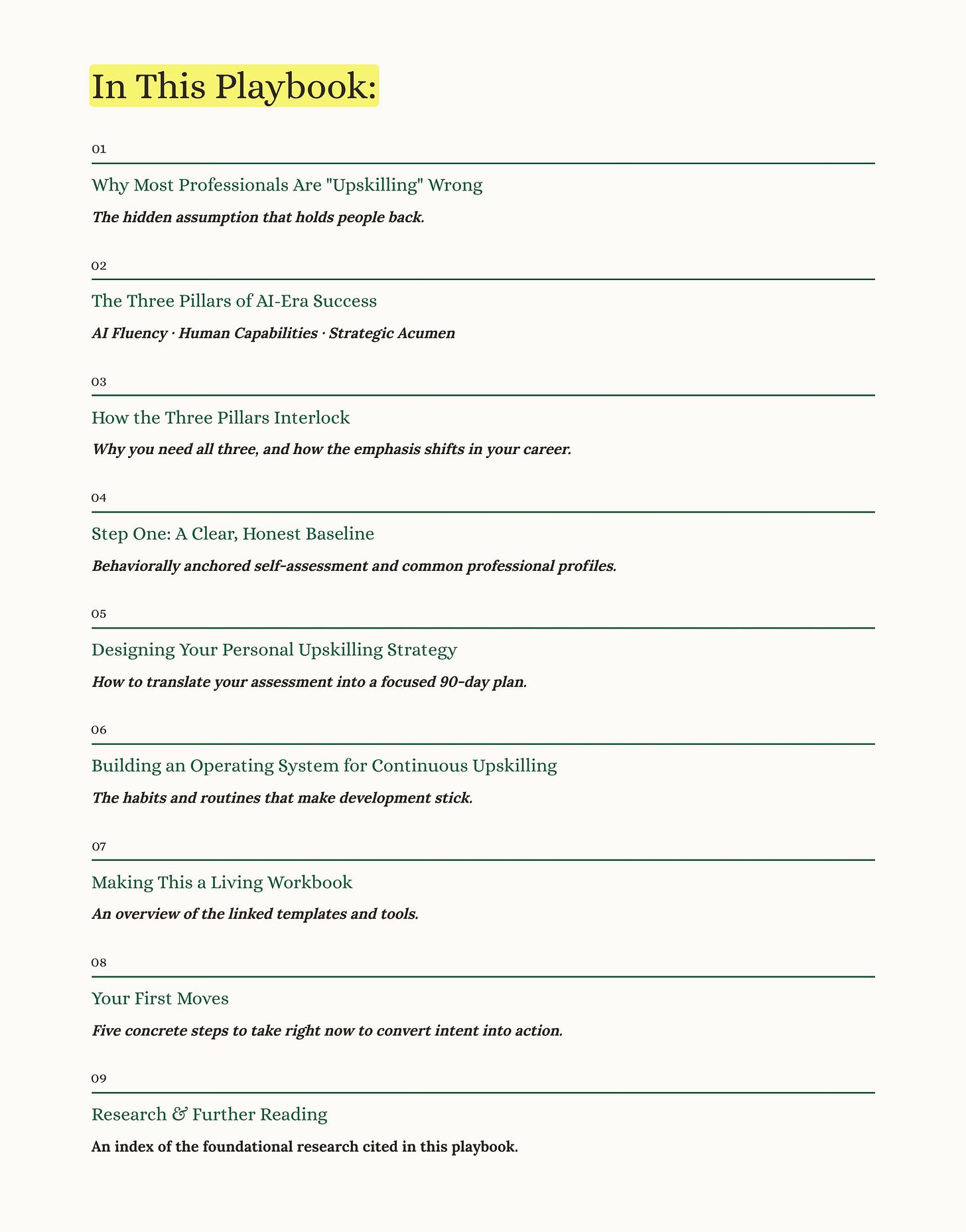 Throughout you’ll find linked resources (assessments, worksheets, and templates) that turn ideas into concrete action. As those tools expand and evolve, this article remains the canonical source: the master guide to your AI-era upskilling development.