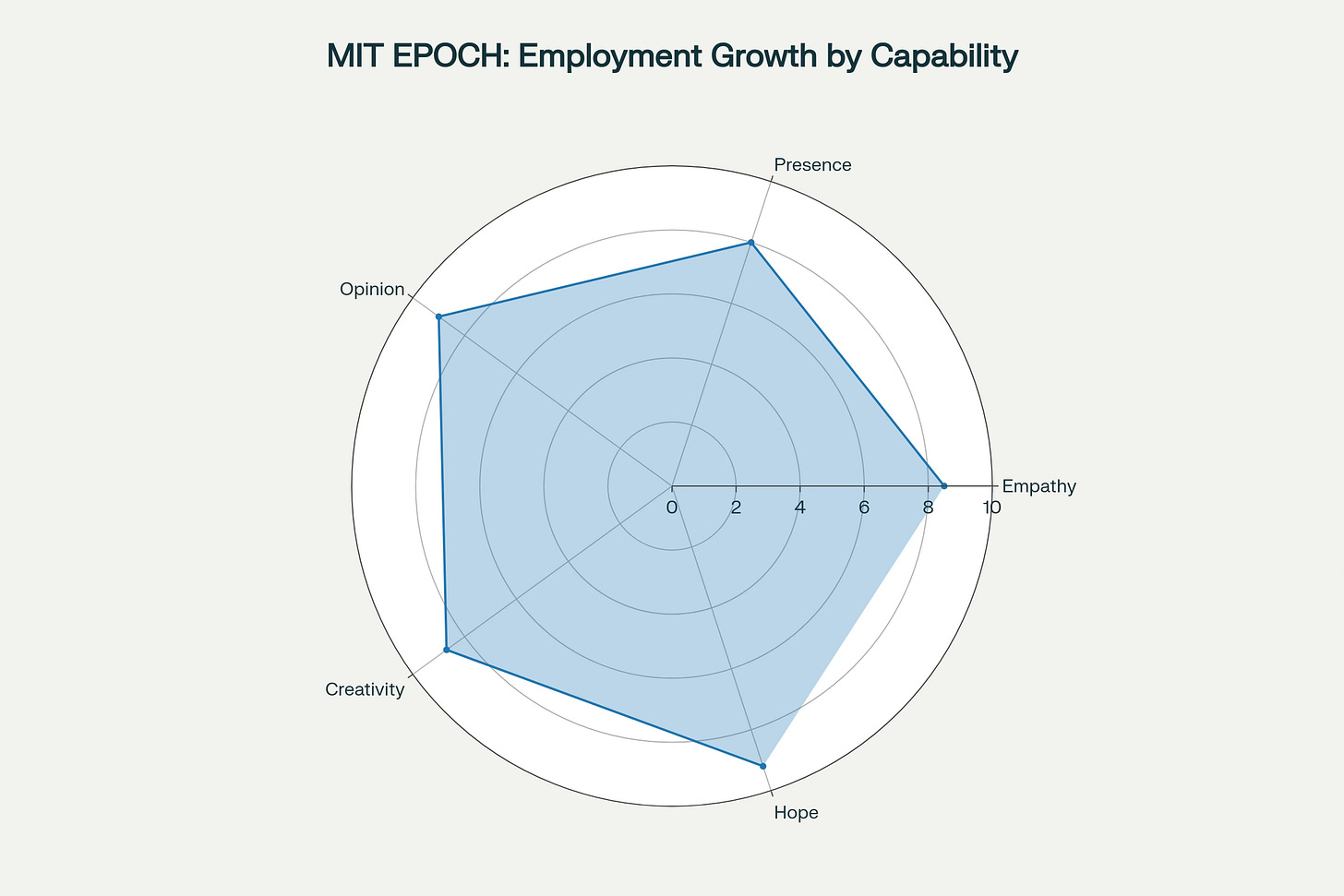 MIT’s work on human‑AI complementarity points to a cluster of capabilities that machines cannot replicate but heavily amplify: empathy, contextual judgment, creativity, the ability to hold and communicate a compelling vision.