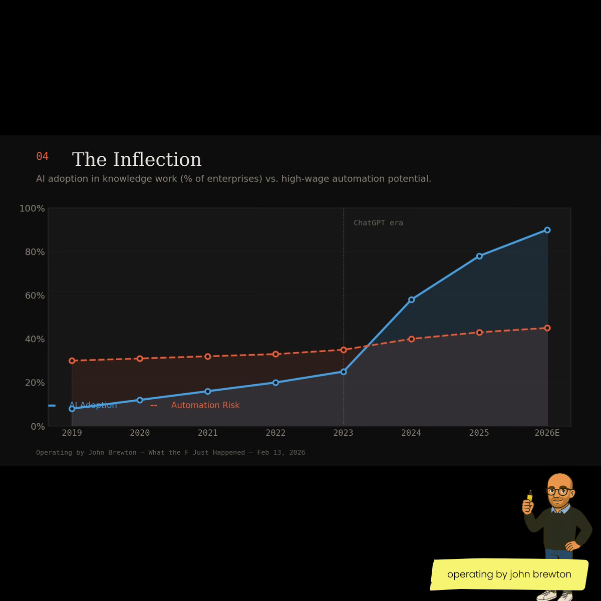 The backstory: AI-exposed occupations grew 38% from 2019 to 2024, but the impact is uneven. High-exposure, high-paying roles saw a 3.5% employment drop over five years, meaning the people who thought they were safe aren’t. McKinsey now estimates AI could automate 45% of high-wage activities by 2030, up from 30% pre-2023. This mirrors the early 2010s industrial automation wave but at a faster clip and aimed squarely at white-collar work. The companies winning right now aren’t replacing people wholesale, they’re building hybrid models where fewer people do more. That’s the real story. And it’s been building since the mid-2010s when basic AI tools first started reshaping operations.