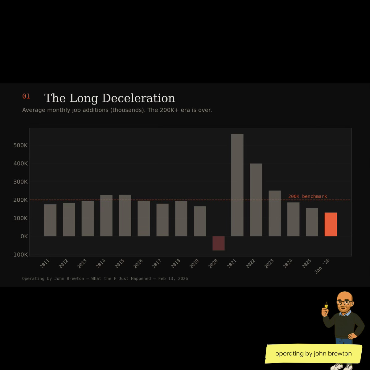 The backstory: This is not a hot labor market. In the mid-2010s, we were averaging 200,000+ jobs a month coming out of the Great Recession. That number has been decelerating ever since, driven by two forces nobody wants to talk about: automation eating low-skill roles and an aging workforce shrinking the labor pool. Prime-age labor force participation hit 83.3% in 2024, its highest since 2000, but that’s the ceiling, not the floor. The BLS quietly revised hundreds of thousands of jobs out of 2024–2025 estimates. Translation: the labor market has been softer than reported for a while. January’s number isn’t a rebound. It’s the new normal.