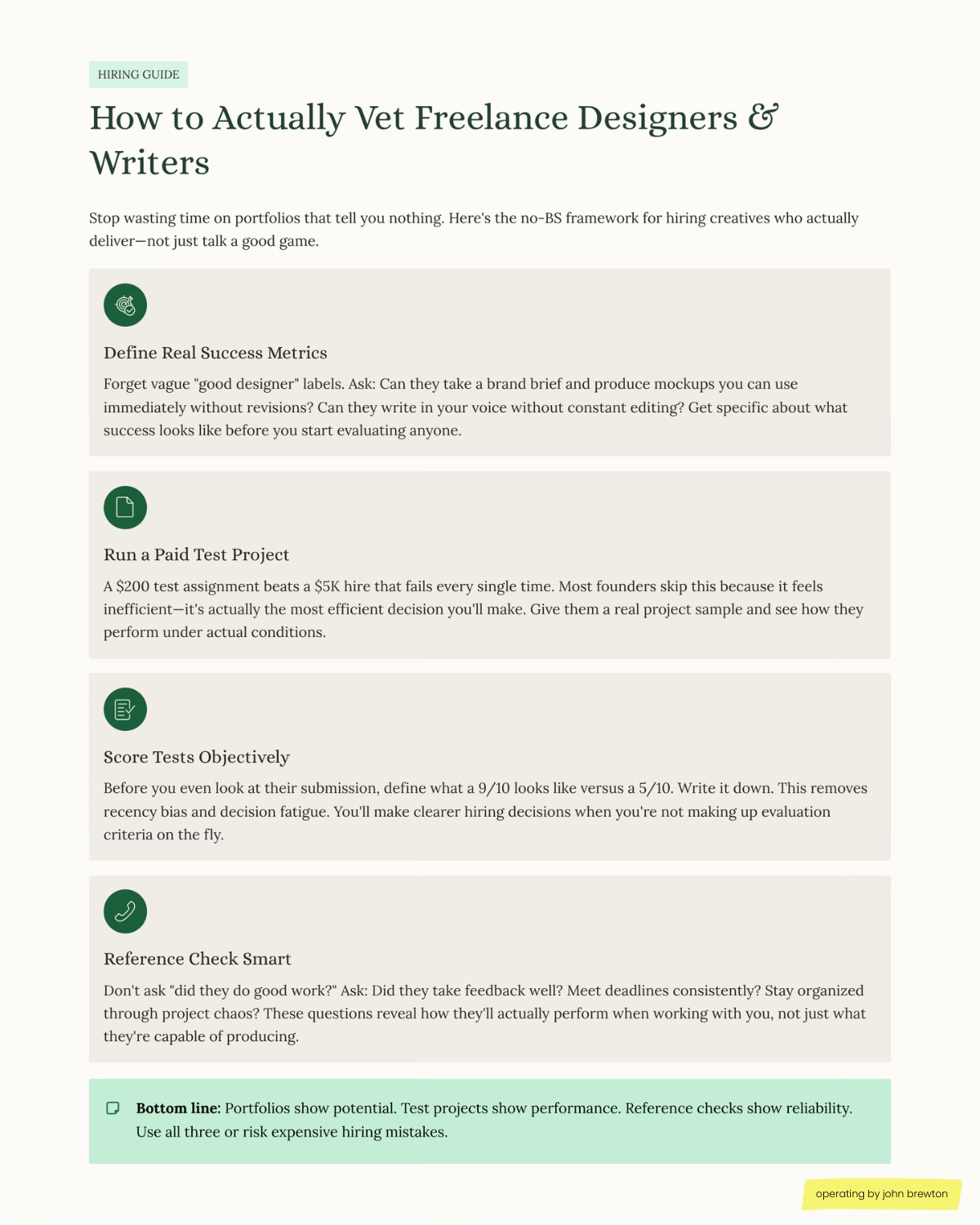 The solution is mechanical. When you’re evaluating contractors, don’t rely on portfolio alone. Structure it: